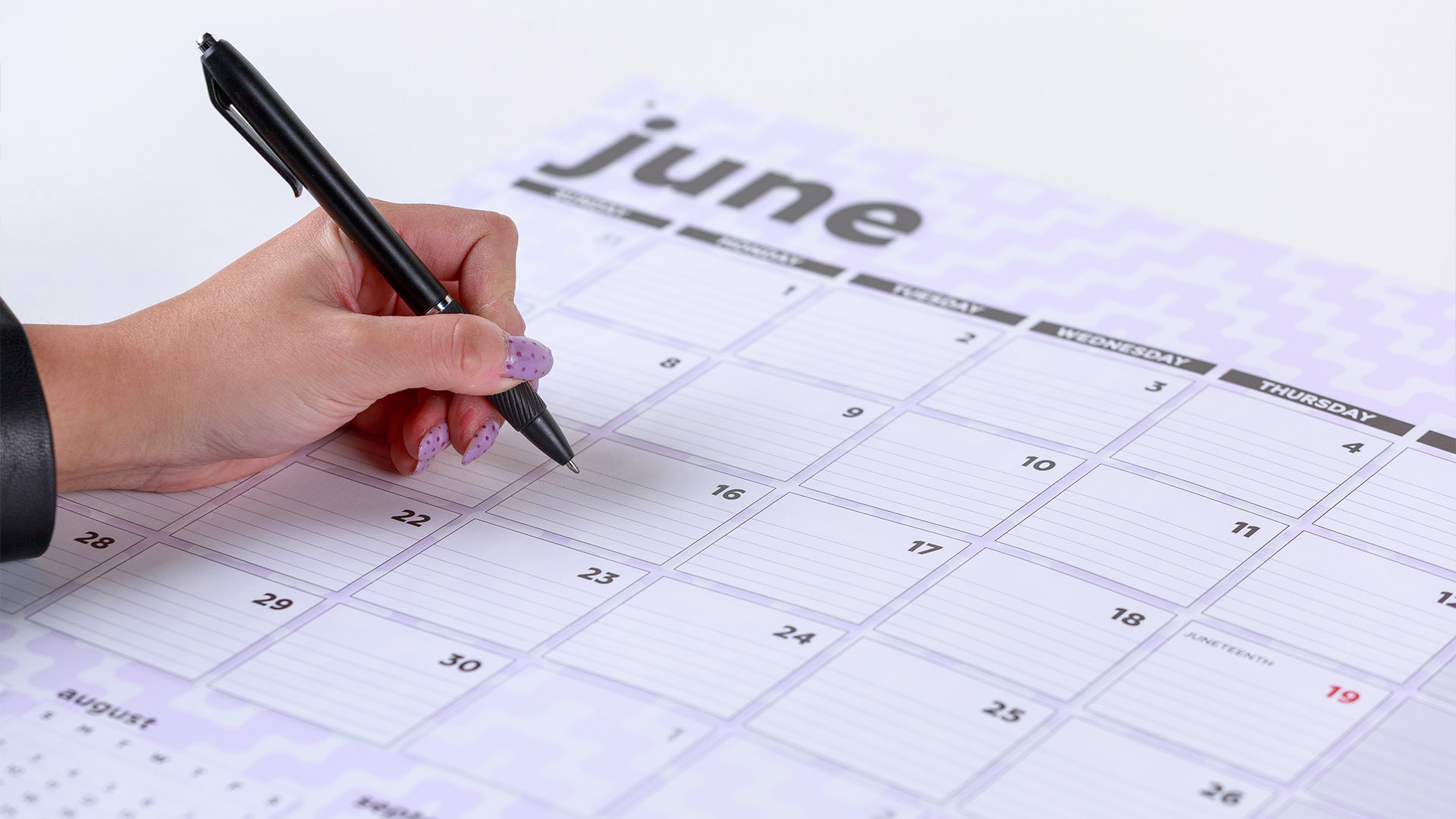 The calendar pages are printed on Insper M Rough 84# Text paper from Hansol. A 24pt. backer serves as the backer, ensuring durability throughout the year. Additionally, the paper is carbon-balanced in partnership with the World Land Trust, offsetting emissions from manufacturing and transportation.