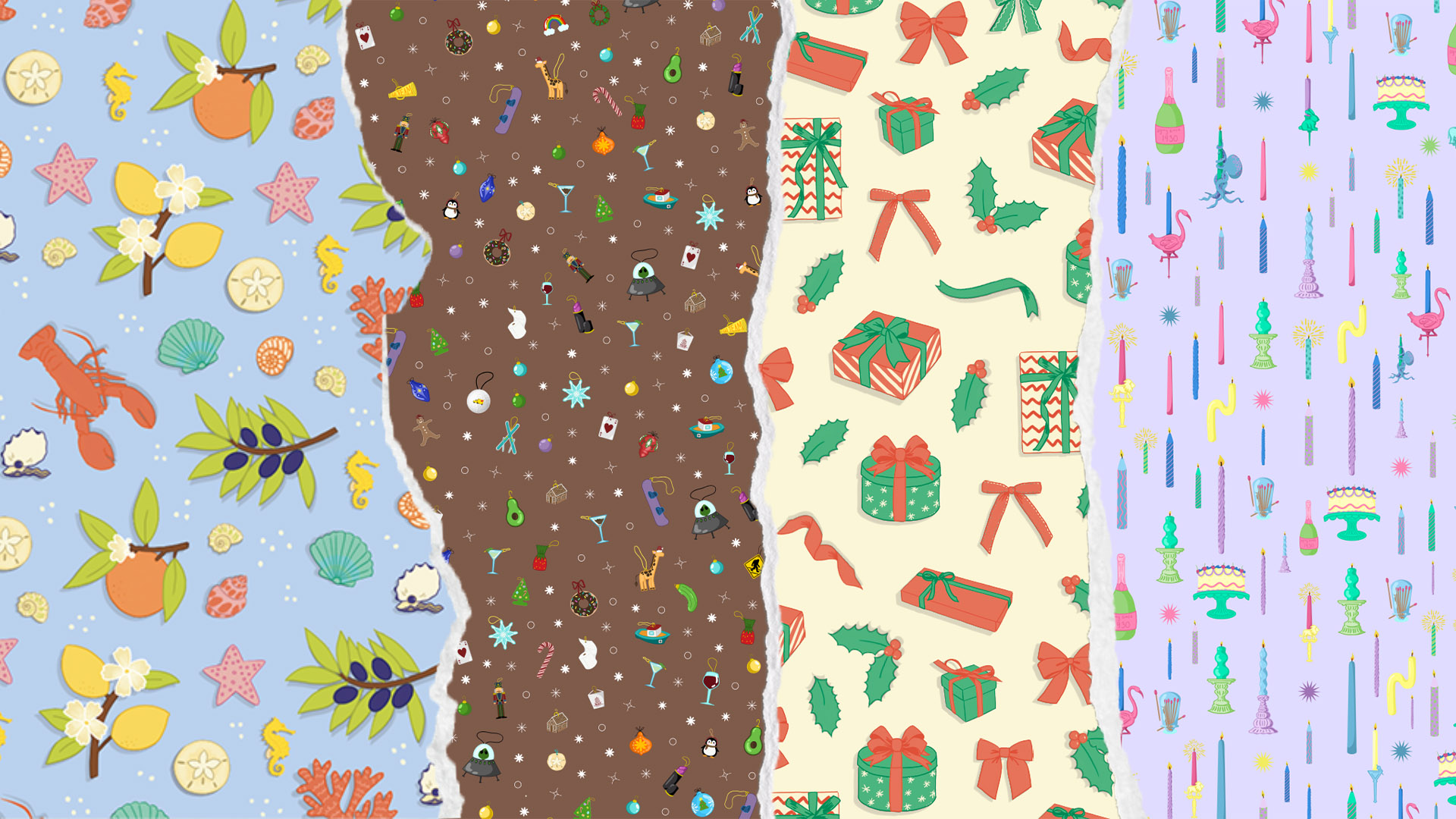 Festive ornaments and celebration candle patterns by Maddie Lambert.